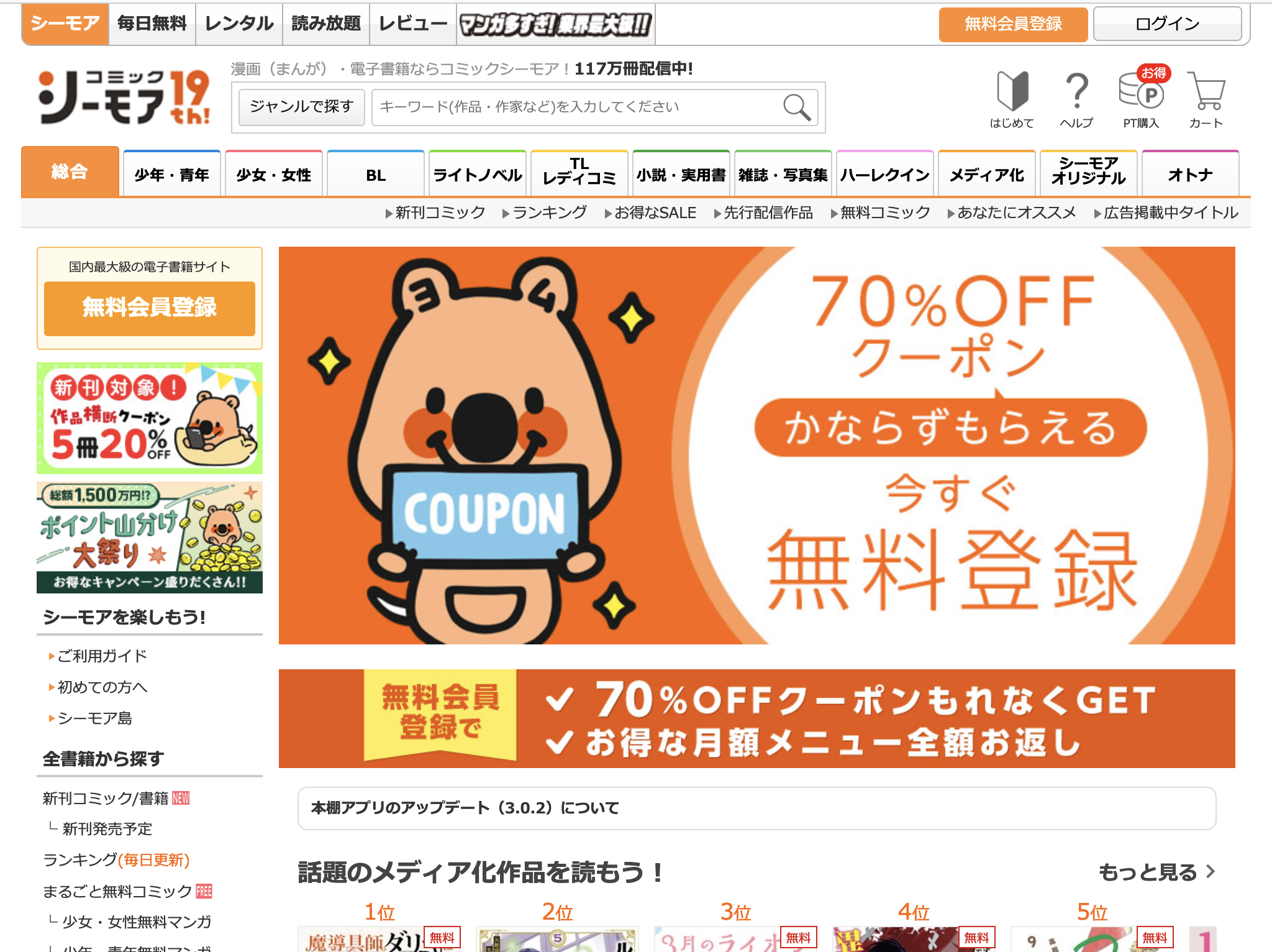 具体的には、初めてコミックシーモアを利用する際に、ストア内の本の中から1冊を選び、その価格を70%オフの特別価格で購入することができるという特典が提供されています。